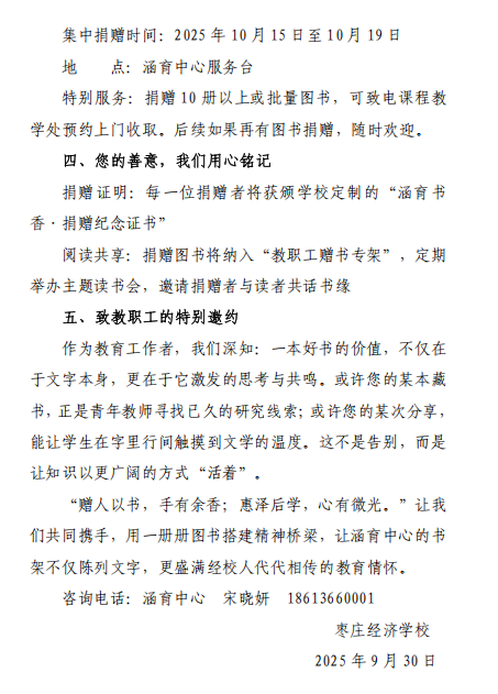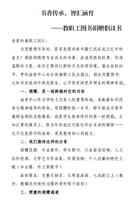 为营造书香校园氛围,推动知识共享与传承教育初心,涵育中心于9月发起“书香传承,智汇涵育”图书捐赠倡议,号召广大教职工捐出闲置图书,让知识在流动中焕发新生。倡议发出后,得到现代服务系、信息系、现代商贸系、智能制造系与高职升学部积极响应。