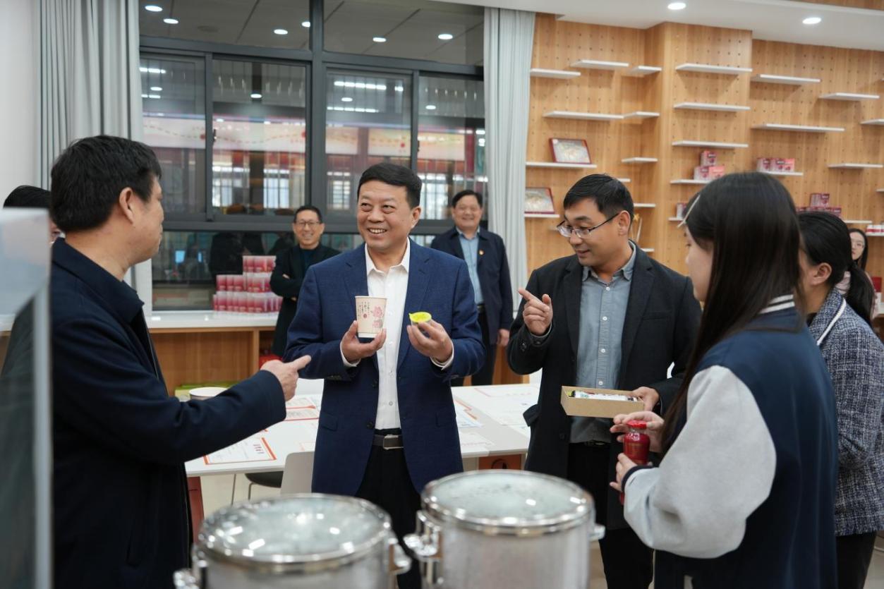 陈永生先后走进学校非遗传承创新实践基地、新媒体技术开发实训基地、直播电商实训教学基地及文化涵育中心,通过实地察看、听取介绍、互动交流等方式,详细了解各基地的功能定位、教学模式、校企合作及成果转化情况。他指出,党的二十届四中全会强调“扎实推进文化强国建设”“大力繁荣文化事业,加快发展文化产业”,枣庄经济学校的这一创新做法,正是对全会精神的生动践行,要进一步挖掘鲁南非遗文化的时代价值,推动创造性转化、创新性发展,为文化强市建设培育更多 “非遗传承人”“文化守护者”。