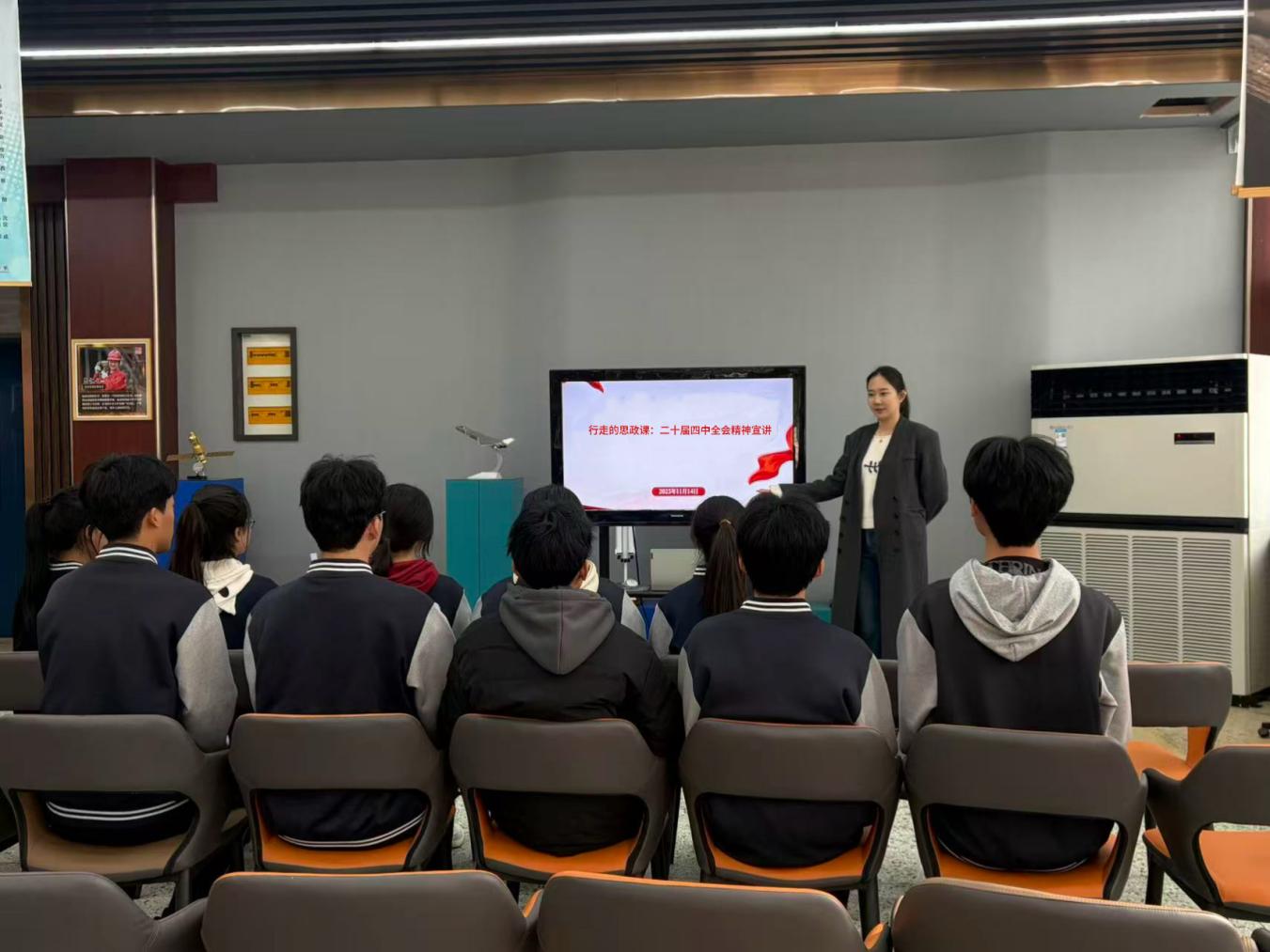 为深入学习宣传贯彻党的二十届四中全会精神,创新思想政治教育形式,近日,我校知行社团在校涵育中心成功举办“行走的思政课:二十届四中全会精神宣讲”主题活动。本次活动由党群工作处倪娟主任主持,王文靖老师、邢敏老师及部分知行社社员共同参与,将理论宣讲与互动实践相结合,让党的创新理论“声”入人心,在校园内引起了热烈反响。