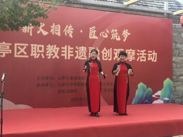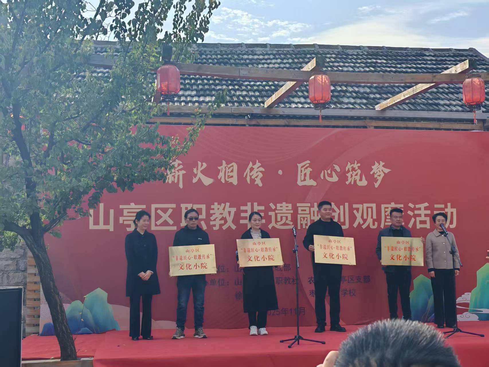 活动集中展示了山亭非遗工作室,职校非遗传创作品以及山亭特色节目。为4个非遗工作室授予“职教传承文化小院”牌匾和客座讲师聘书,进一步推动了非遗技艺从“指尖传承”向“校园和产业”传承,深化了“非遗职教”融合机制,旨在助力乡村振兴和文旅产业的持续发展。
