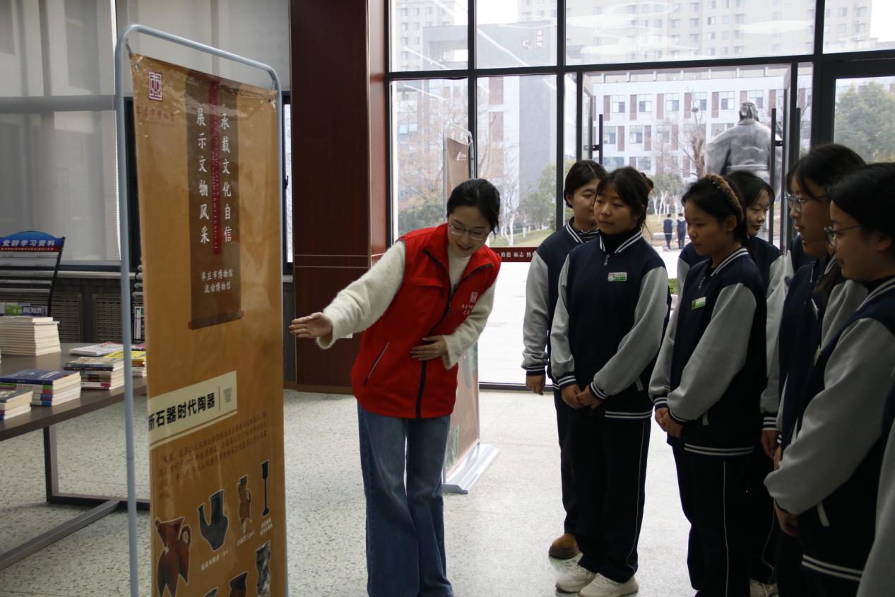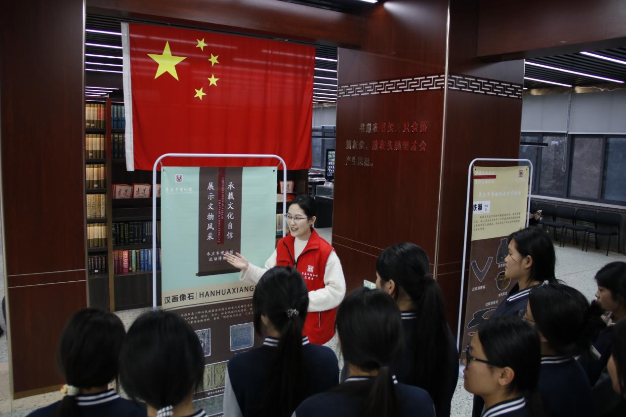 活动伊始,枣庄市博物馆专业讲解员携流动展板进校园,为学子们带来生动鲜活的“移动博物馆”专题讲解,让大家初步领略了历史文物的独特魅力。为深化文化认知,讲解员随即以图文结合方式,进一步解读汉画像石的文化密码:从市中区小山汉墓群出土的汉仙境画像石,到玉兔捣药、扶桑神树、双鱼纹饰承载的古人祈愿,再到象征吉祥的灵动凤鸟,生动阐释其背后的丧葬观念、精神信仰与浪漫想象,为学子们带来沉浸式文化熏陶,切实提升了本土历史文化认知度。