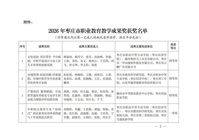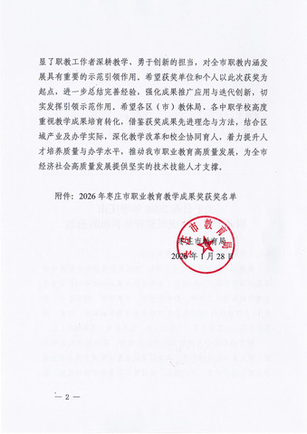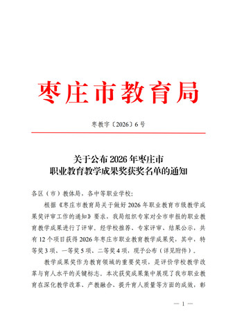 在2026年度枣庄市职业教育教学成果奖评选中,我校斩获特等奖1项、一等奖1项、二等奖1项,再创佳绩。